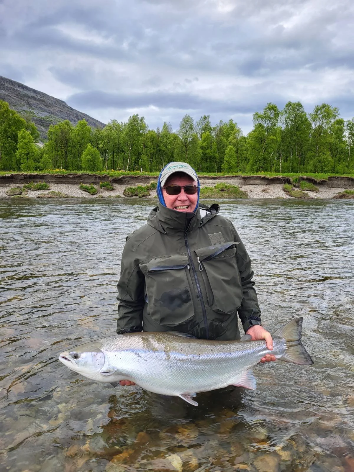 The next days didnt have as much activity as we would have hoped. But on the last session of the week this all changed. Bill was again on the spot this time in our famous Homepool. It didnt take long for both Bill and his guide to realize that this was not a small fish. From the moment the fish took the fly the battle was on and Bill got all of his fighting skills tested. Eventually after a great fight the fish gave in and was securely nettet. The great salmon was an extraordinary conditioned female of 101 cm and 13.8 kg. The fish was offcourse released. An absolutly stunner of a fish and Bills personal best. First PB off the season and for sure not the last one. Also the first real big Lakselv fish in the books for this season.
