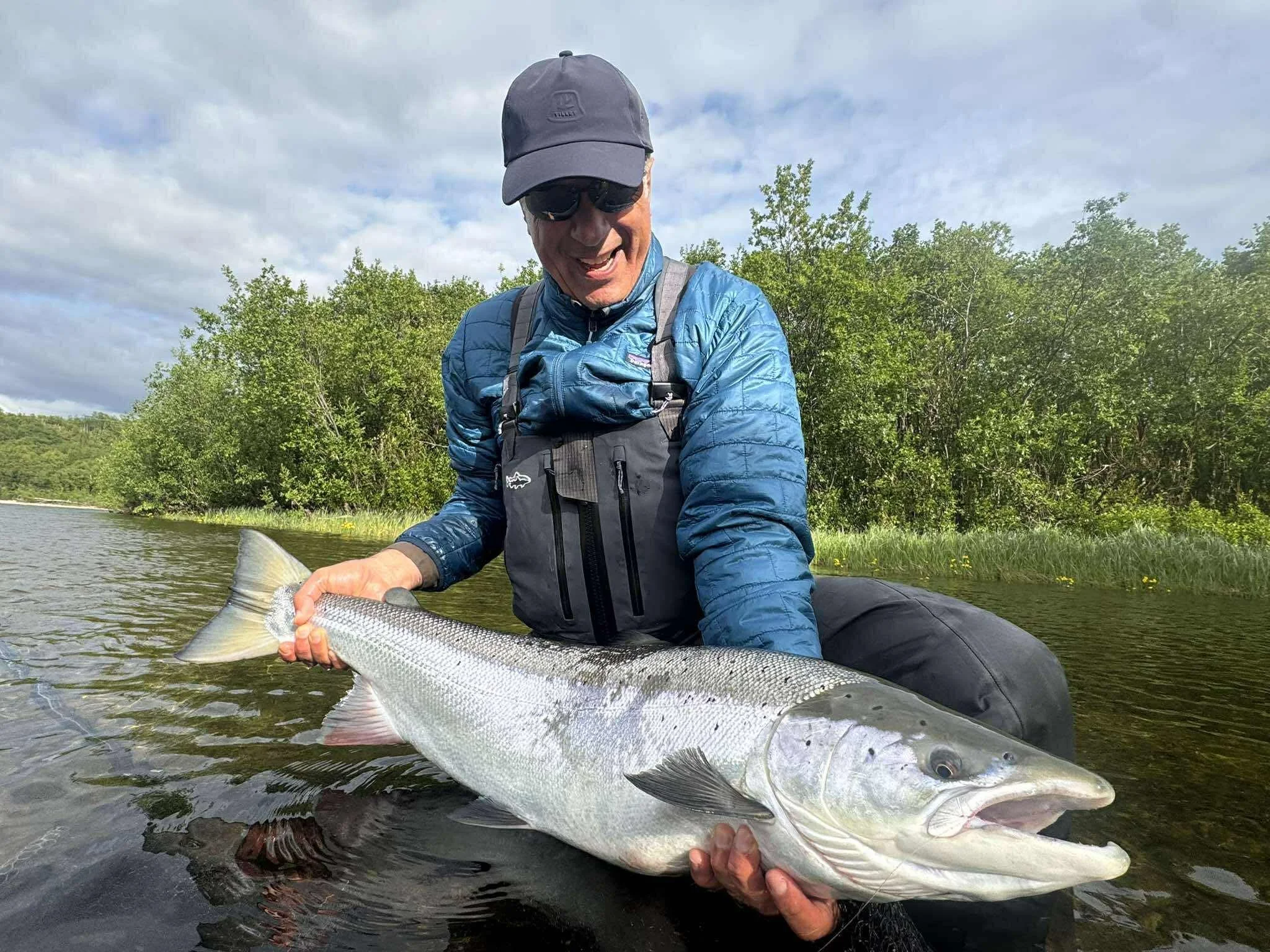 The day after it was Georges turn to try forces with a Lakselv monster. George beeing a seasoned angler with very big fish on his resumé had no doubt that this was one of them. From start to finish he fought the fish very hard and well and could at the end see the biggest Olderø salmon of the season glide into the guides net. A stunning male og 111 cm that draged the scale to 15.8 kg. What a fish to end the week and the first 15 kg + hat of the season was handed out to the happy angler. It looks like exiting times are ahead of us and looking forward to the upcomming weeks.