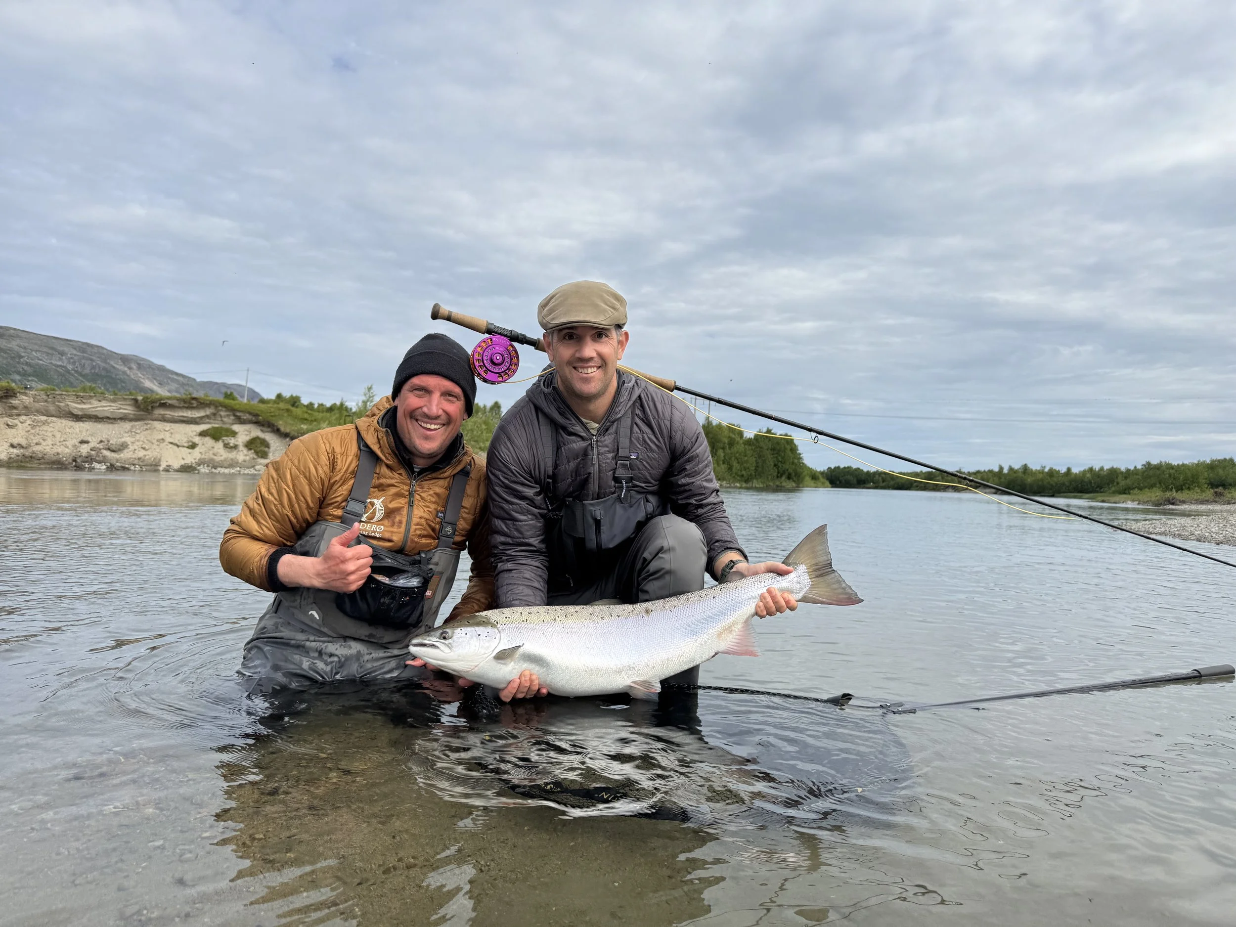 Joe and his dad Phil where here visiting us for the first and would be in for a real lakselv treat. On monday morning they where fishing in zone 1 and it did not take long for Joe to hook into a nice fish that he unfortunally lost. Not long after he would have another chance. This time the fish stayed on and turned out to be a really nice hen fish that weighed 8.6 kg.