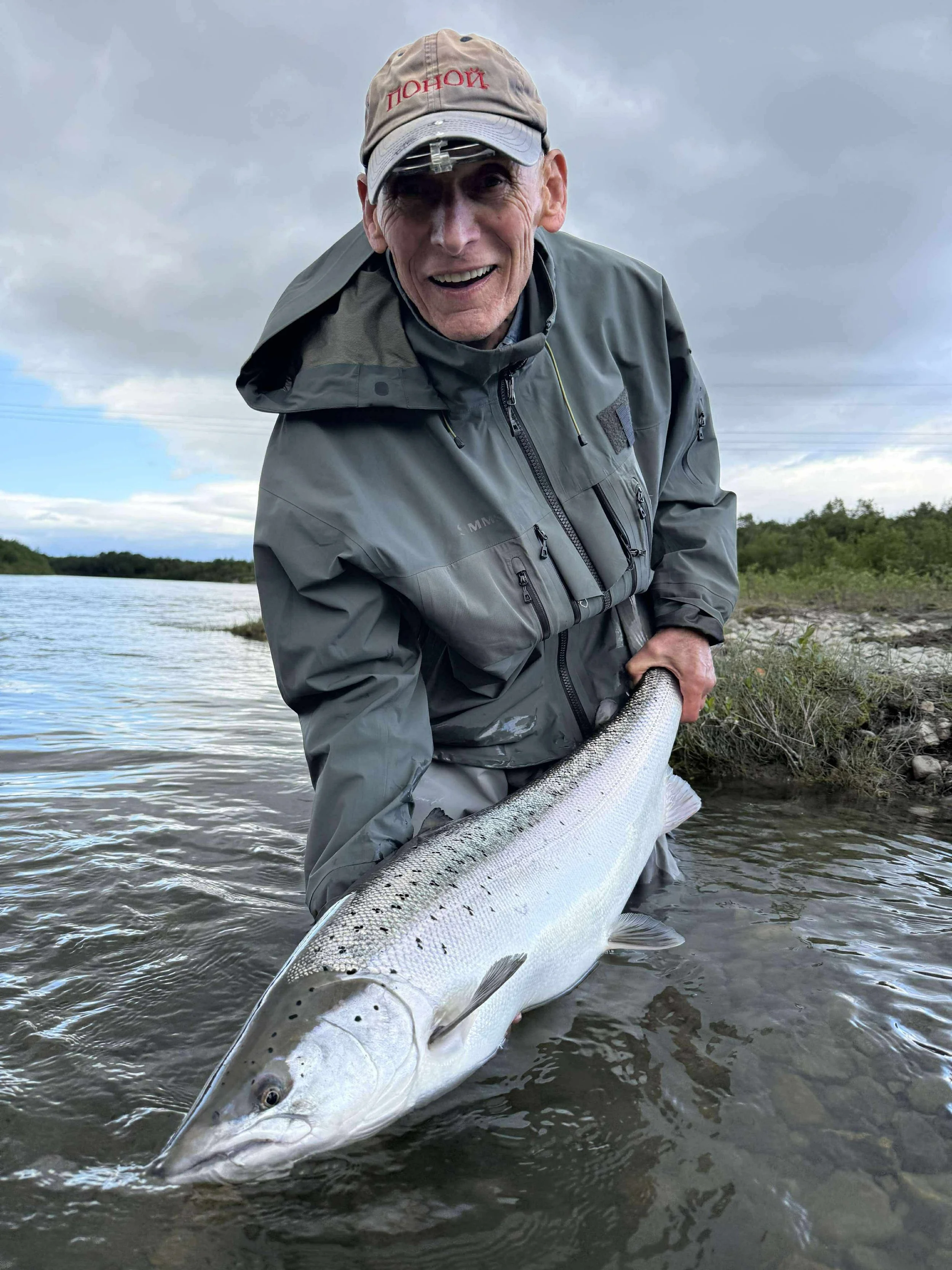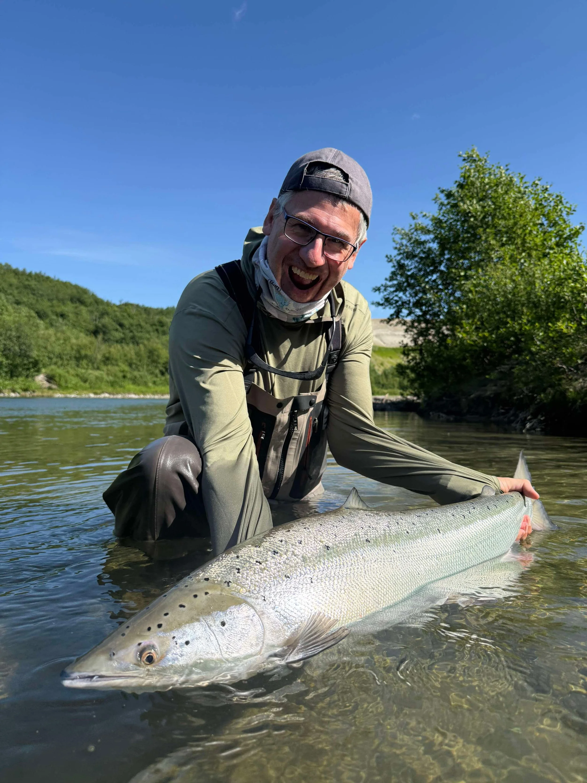 Our arriveing guests was a good mixture of familiar and new faces. Hearing tales about how last week ended everybody was ready to jump into their waders and fishing. It didn't take long for 82 year old Fritz to continue the trend of hooking into big fresh fish. Fritz was fishing his warm up session in Zone 1 where he would soon find himself in a battle with big one. The fish gave Fritz an awsome fight but had to admit defeat at the end. The big fresh male salmon messured 98 cm and 10.4 kg and was Fritz new personal best. Great way to start the week and a big congrats to that after many years of fishing finally got a 10 kg + to his name.